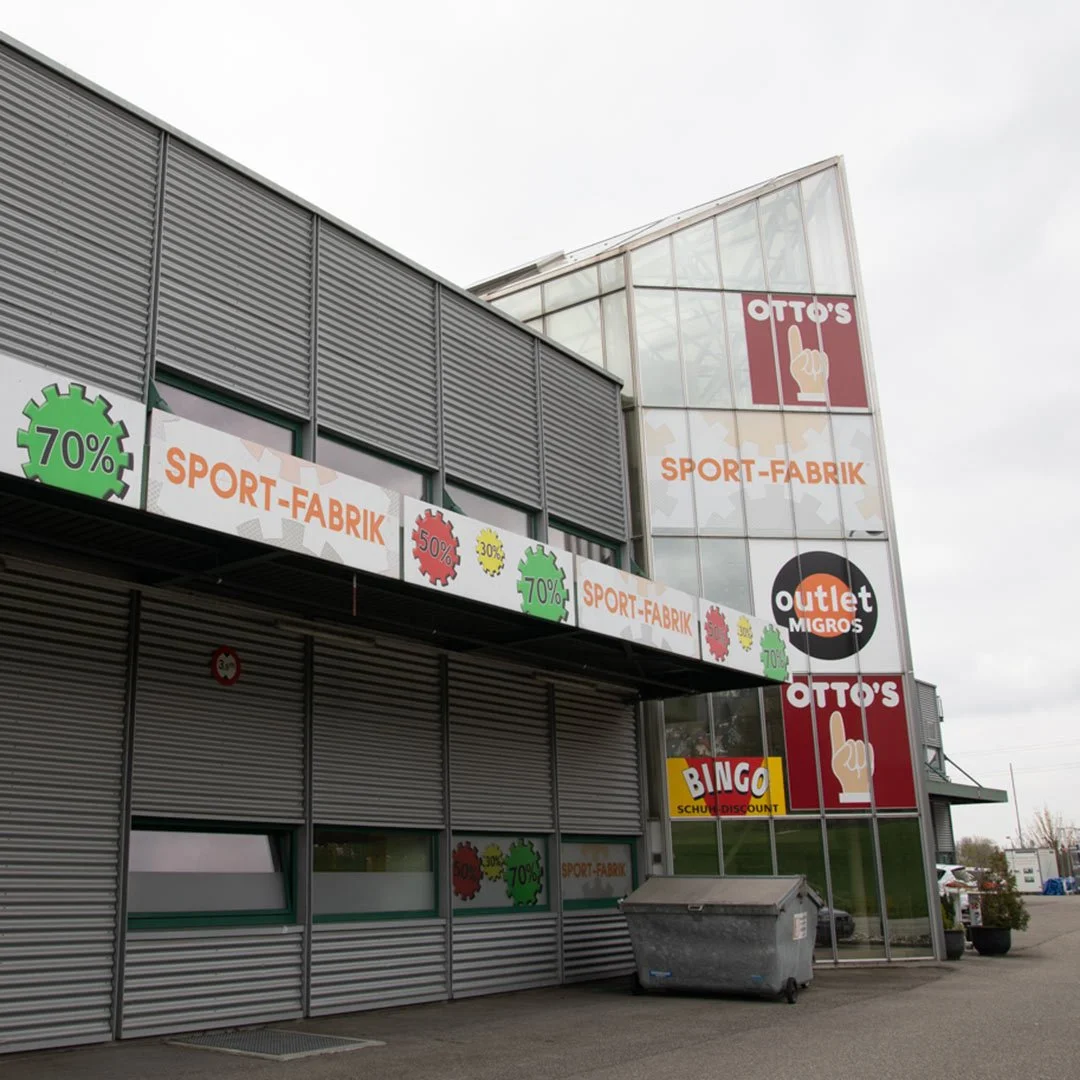 Außenansicht eines Geschäfts mit Schildern für Rabatte und Angebote, darunter 'SPORT-FABRIK', 'Outlet Migros' und 'Bingo'.